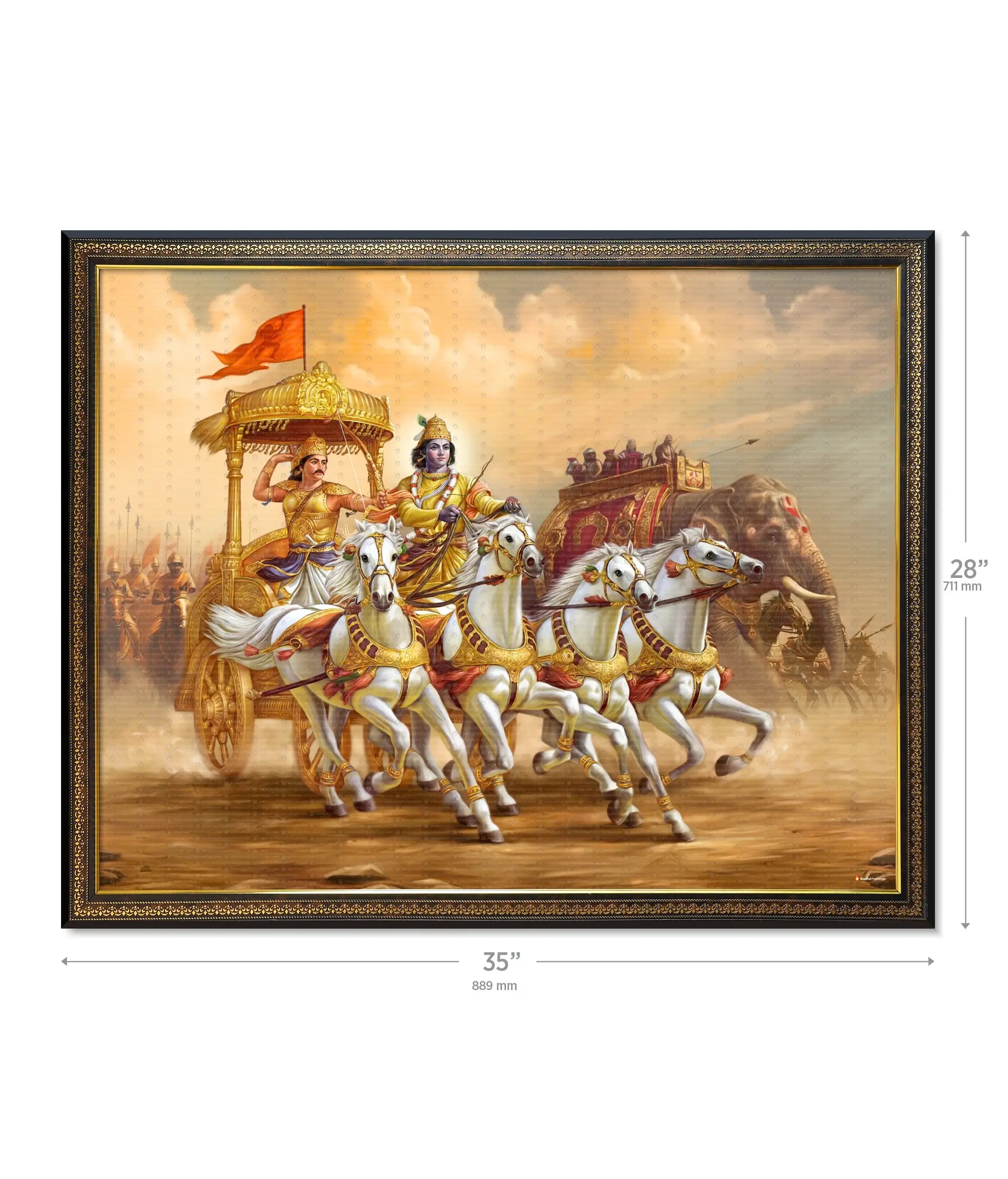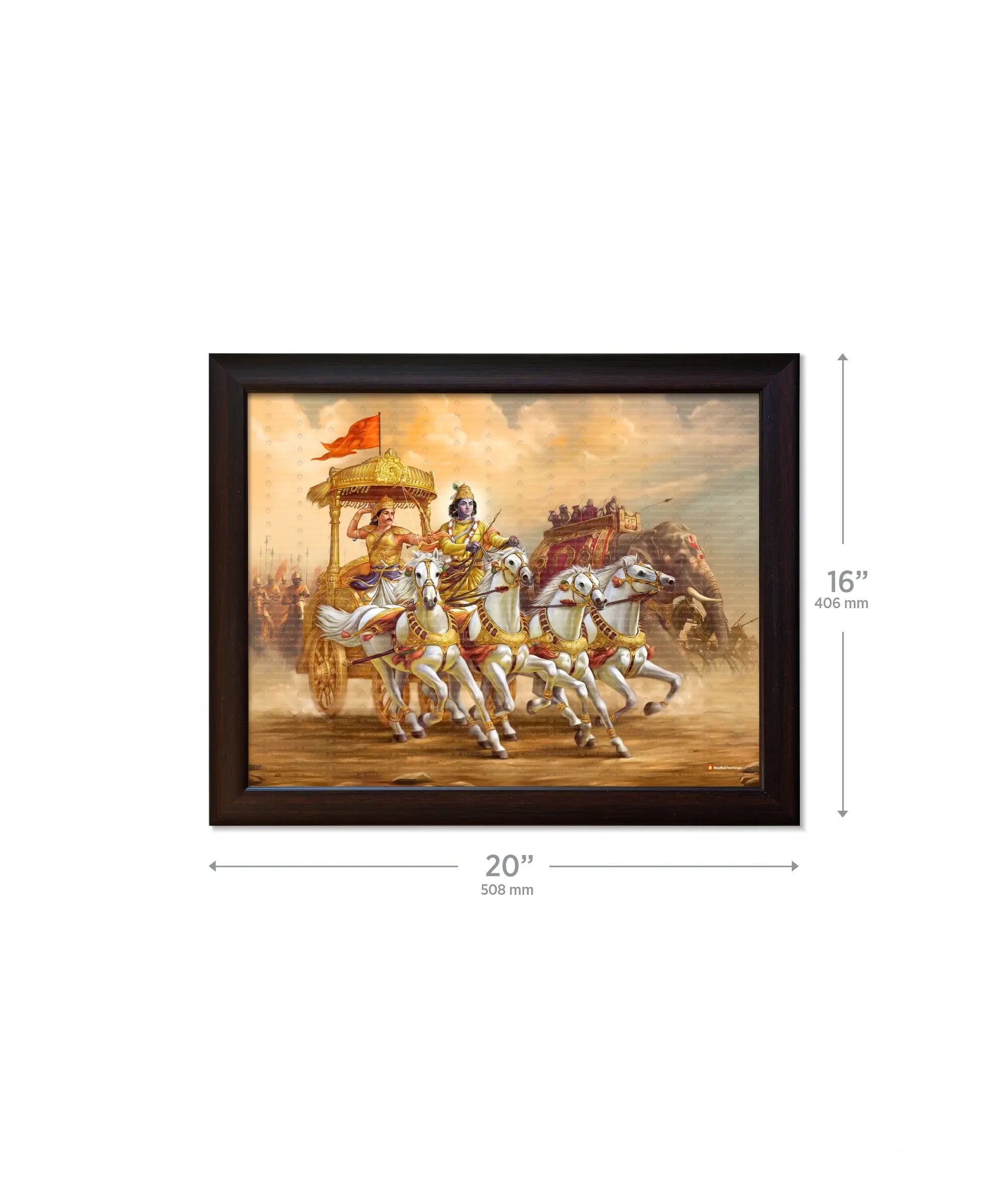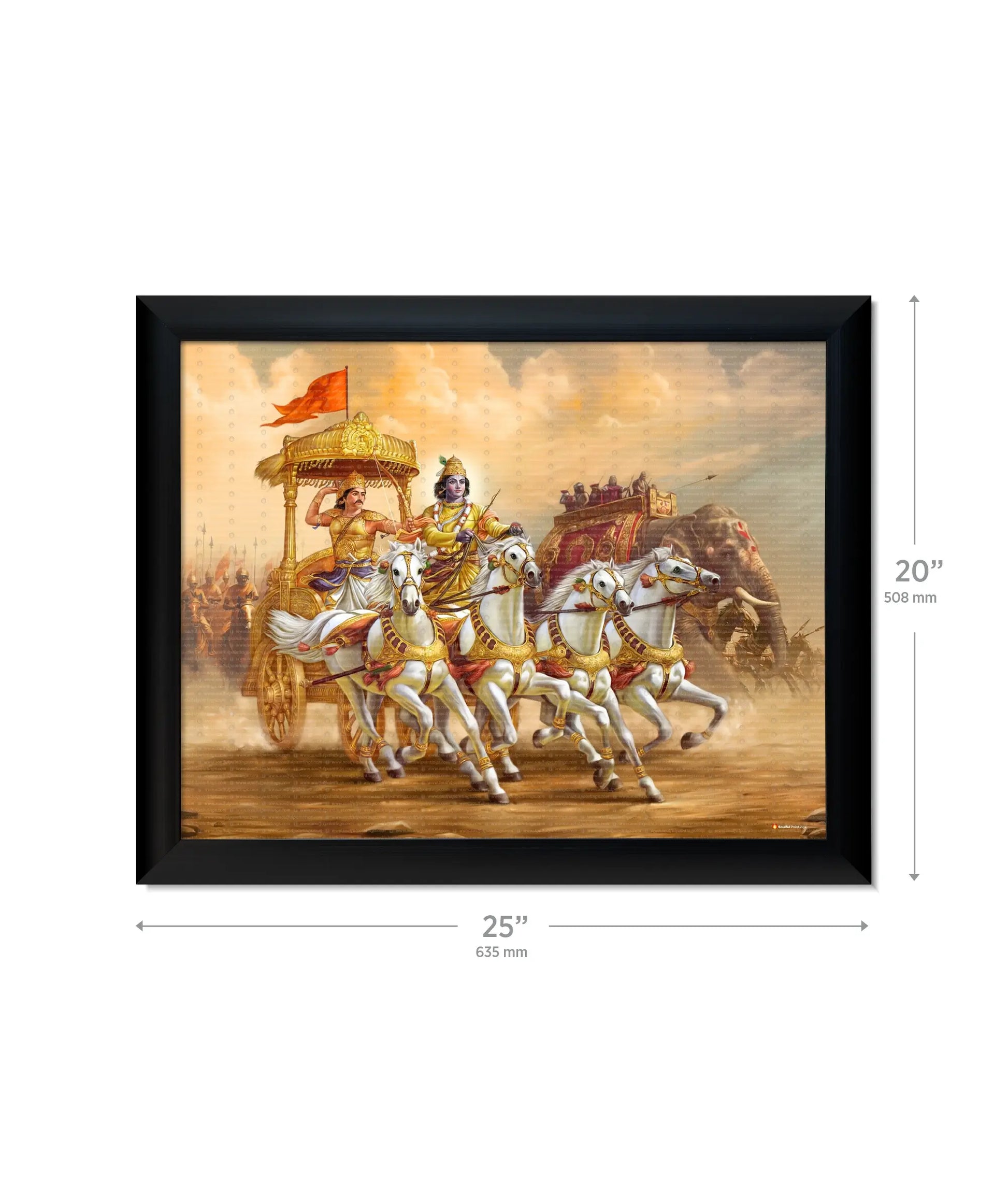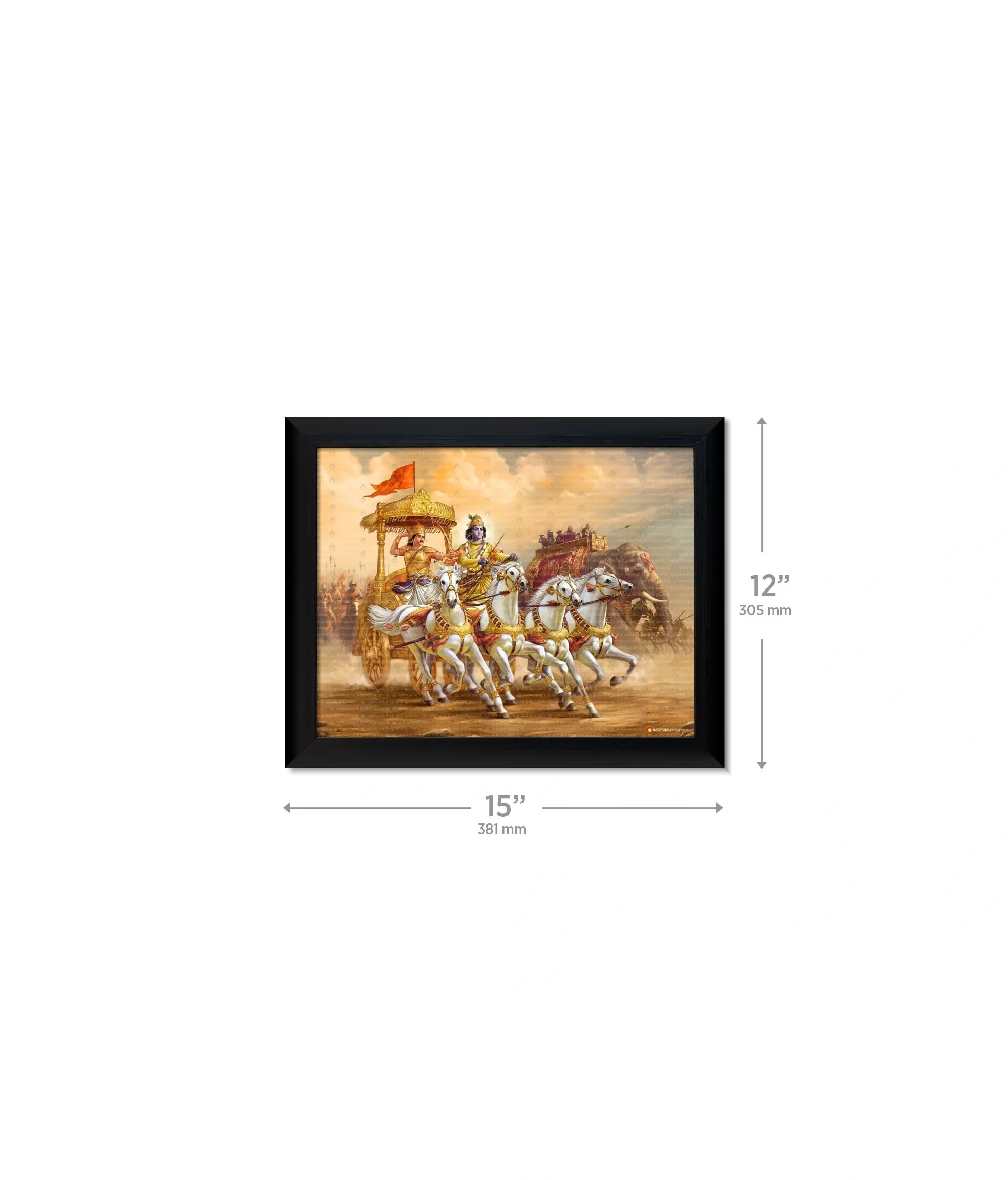 This Mahabharata painting shows Arjuna on his chariot, guided by Krishna as his divine charioteer. Krishna holds the reins while advising Arjuna during the Kurukshetra war, symbolizing duty and righteousness.