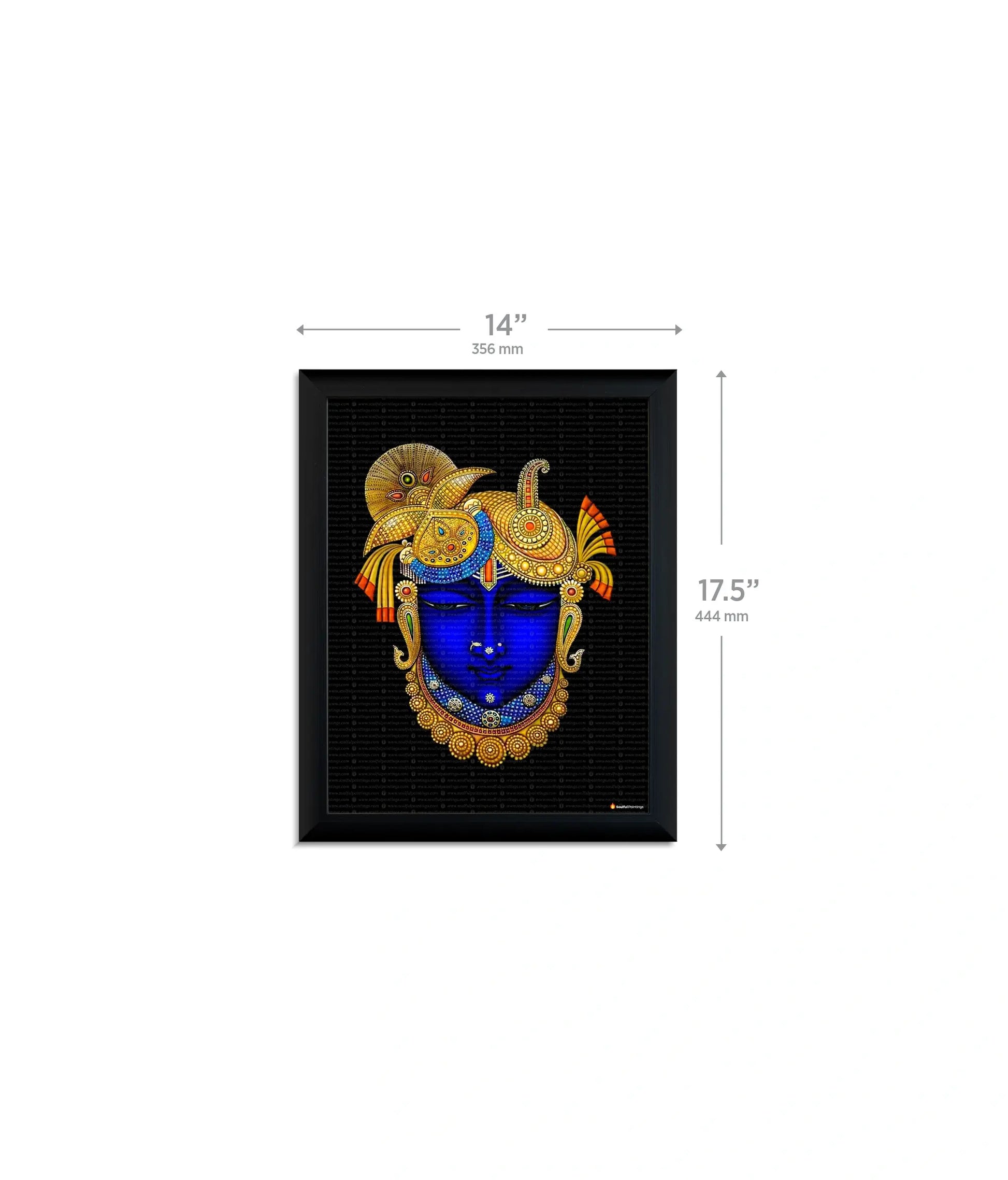 Focused entirely on the radiant face of Shreenathji, this Shreenathji Mukharvind painting is a devotional tribute to the Lord’s divine beauty and grace. Shreenathji is worshipped as a loving and playful form of Krishna, known for his expressive features and benevolent smile.